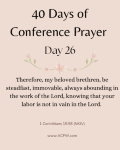 Verse: 1 Corinthians 15:58 (NKJV)–Therefore, my beloved brethren, be steadfast, immovable, always abounding in the work of the Lord, knowing that your labor is not in vain in the Lord.