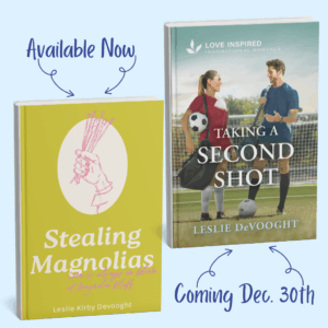 Award-winning author Leslie Kirby DeVooght writes women’s fiction with faith, love, laughter, and a lot of Southern charm. Her stories are inspired by romcoms, coastal Georgia, and fried okra! When Leslie isn’t writing, she’s cheering on her children, and enjoying dates with her husband, who loves that she researches kissing.